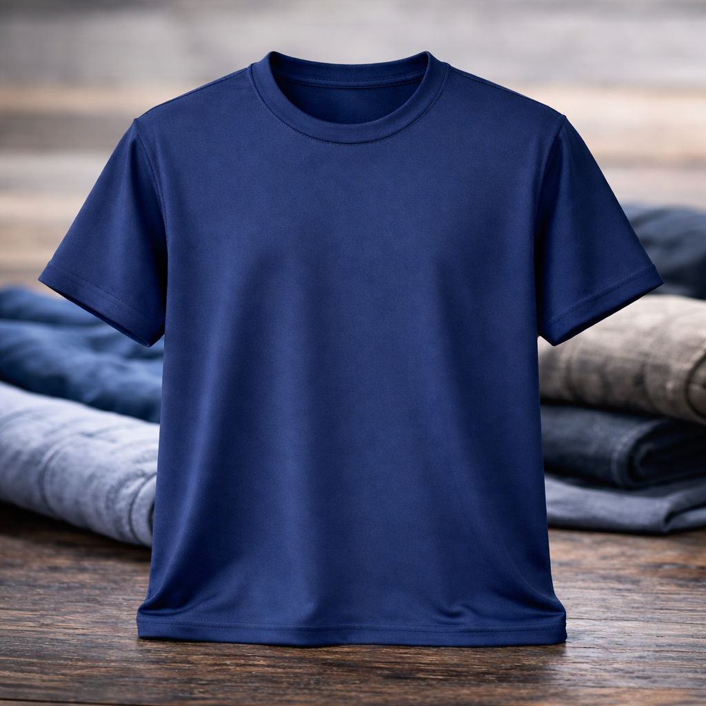 Polyester T-shirt is designed for comfort, durability, and everyday performance. Made from smooth, lightweight polyester fabric, it offers excellent breathability and quick-dry properties, making it ideal for daily wear, sports, or active use. The classic crew neck and short sleeves provide a timeless fit, while the rich blue color adds a clean and modern look. Presented in a flat-lay lifestyle style, the T-shirt highlights its neat stitching and premium fabric finish.